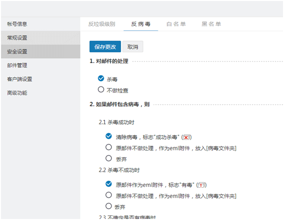 - 如果您购买了并安装 Sophos 杀毒引擎,则系统不仅可以帮您扫描病毒邮件,还可从病毒邮件中清除病毒,对您的邮件不产生任何危害的过程。